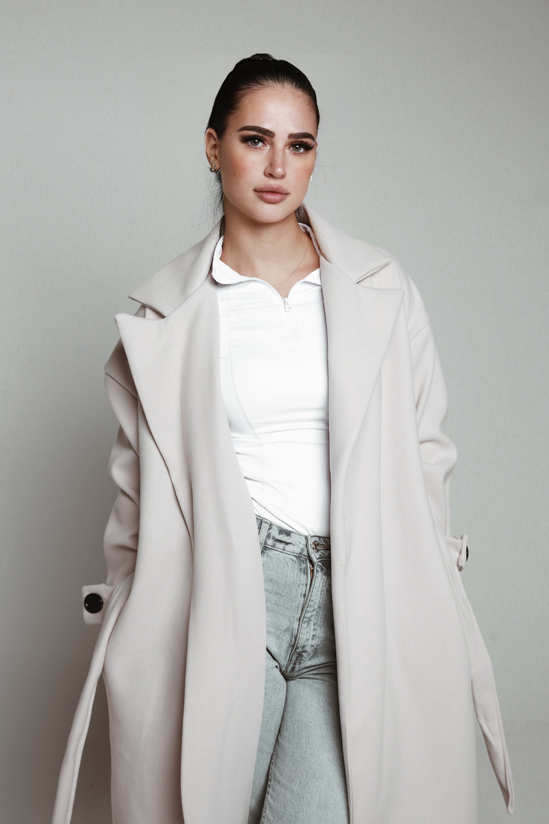 1Klassischer Mantel: Der beige Mantel im minimalistischen Design ist ein Must-Have für jede Saison und unterstreicht die Eleganz. Er passt zu fast jedem Outfit, was ihn zu einem zeitlosen Trendstück macht.