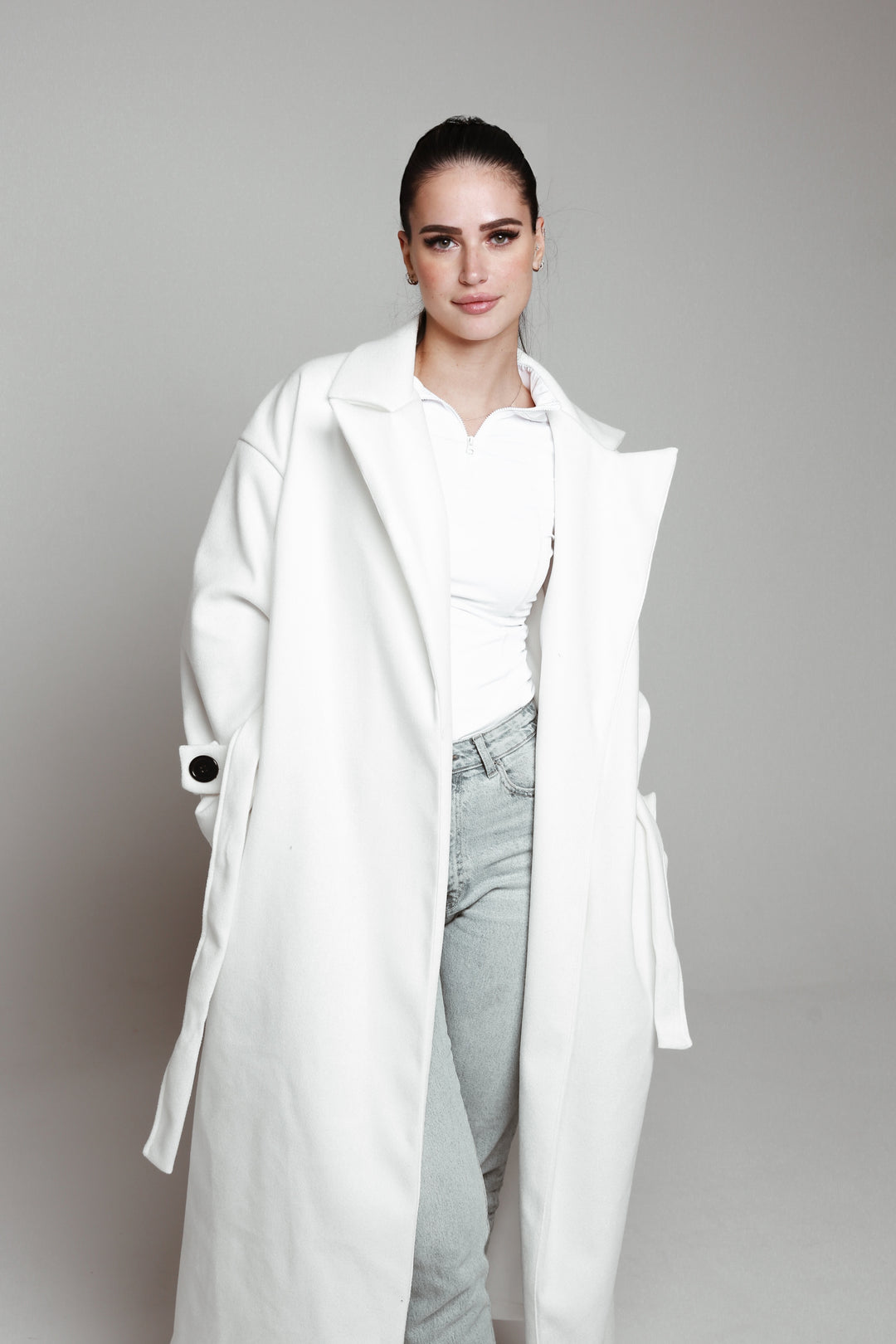 Der Mantel: Der klassische, gerade geschnittene Mantel verleiht dem Look Eleganz, während der lockere Schnitt Bewegungsfreiheit und Komfort bietet.