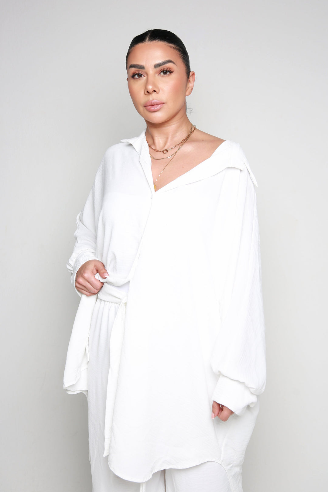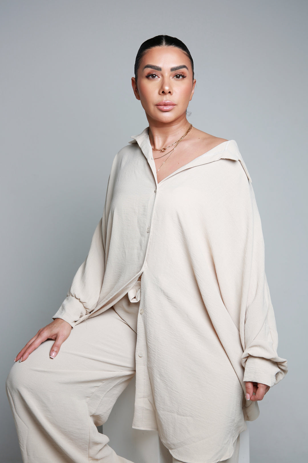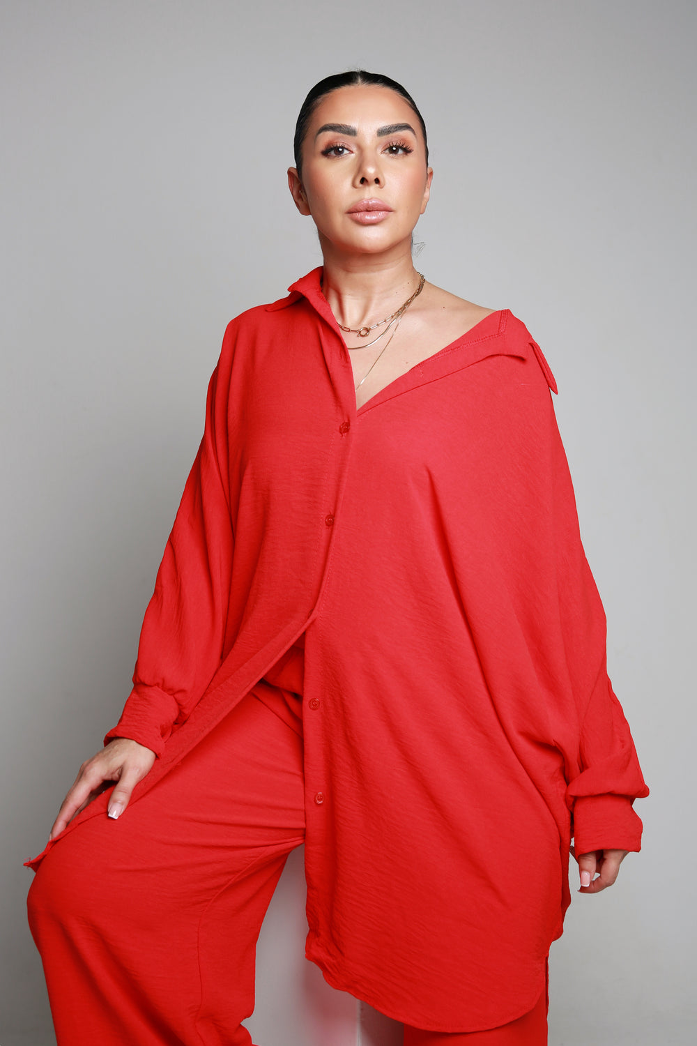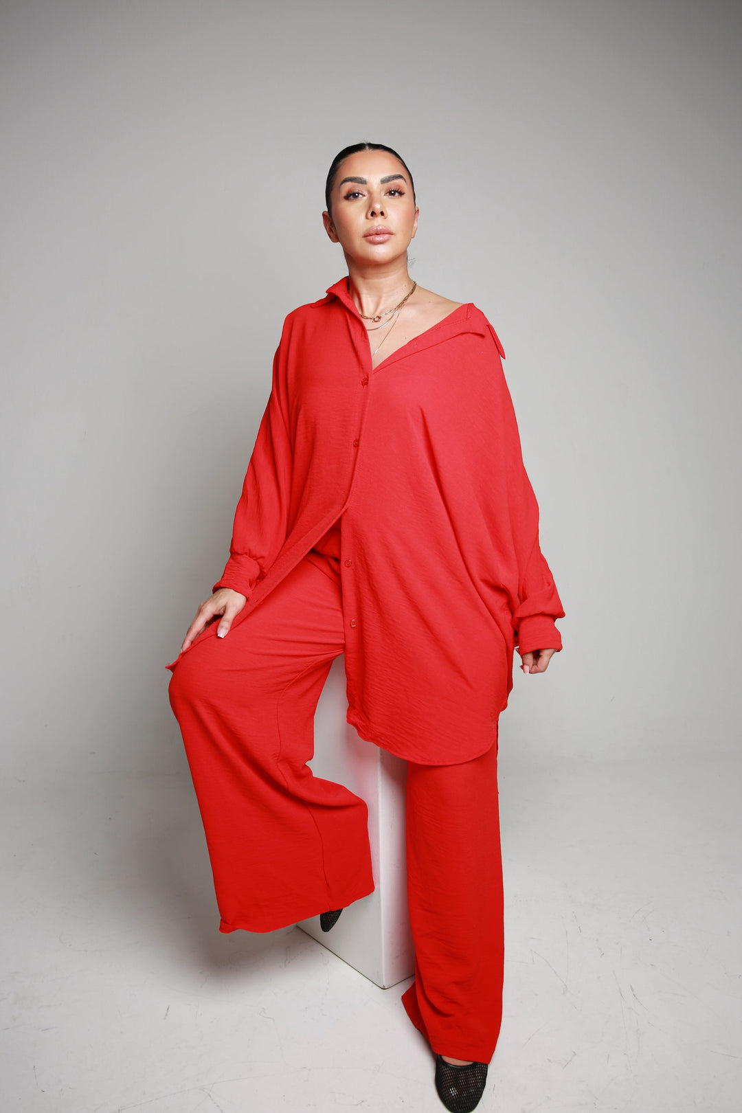 Der Oversized-Stil der Bluse und der weiten Hose sorgt für eine entspannte, aber dennoch elegante Silhouette. Diese Passform liegt voll im Trend.