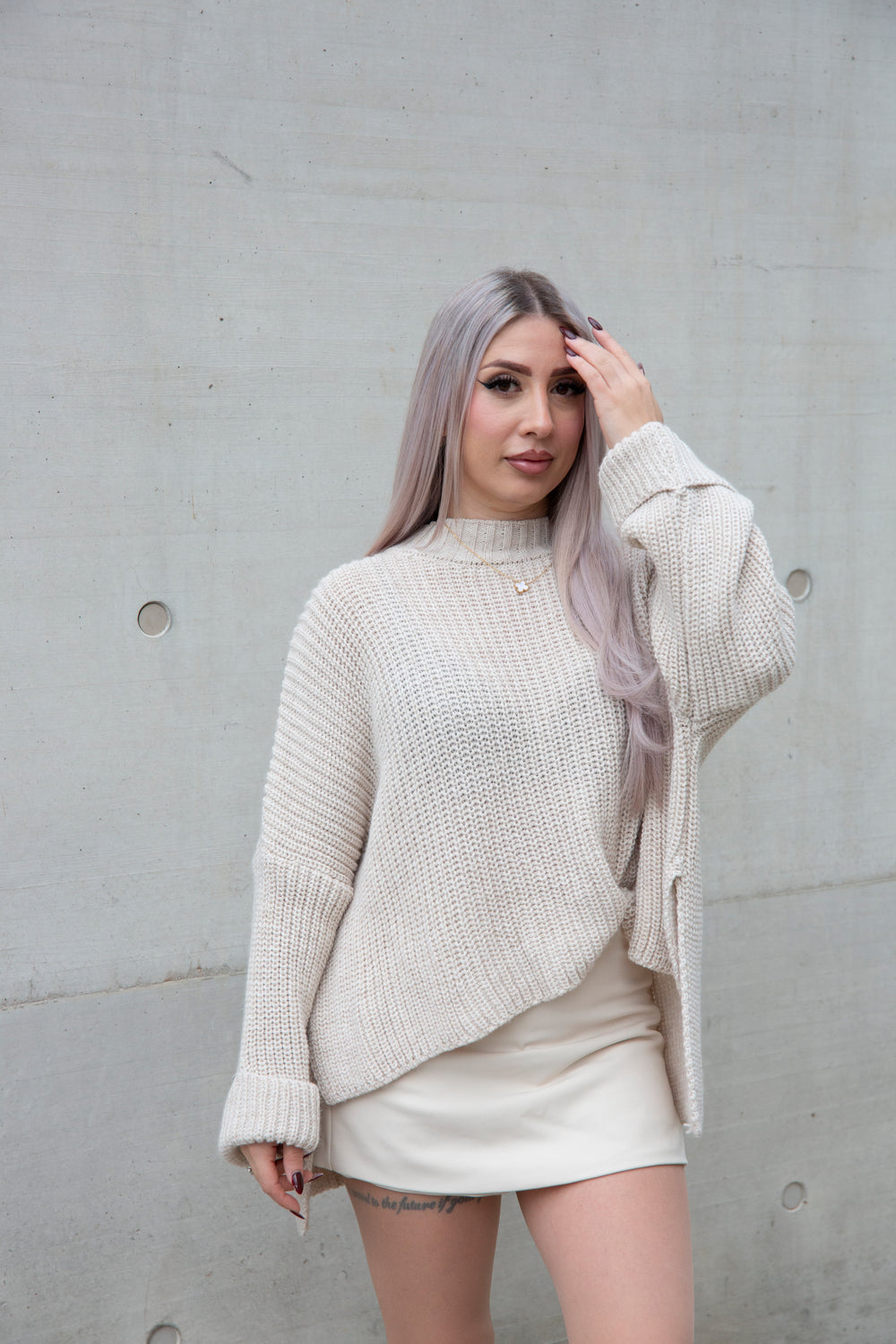 Der Strickpullover ist in einem gehalten und hat eine lockere, weite Passform. Er ist aus grobem Strickmaterial gefertigt und verfügt über einen hohen Rundhalsausschnitt. Die Ärmel sind lang und leicht oversized, was dem Pullover einen lässigen und gemütlichen Look verleiht. Der Saum ist asymmetrisch geschnitten, sodass der Pullover vorne etwas kürzer ist als hinten.