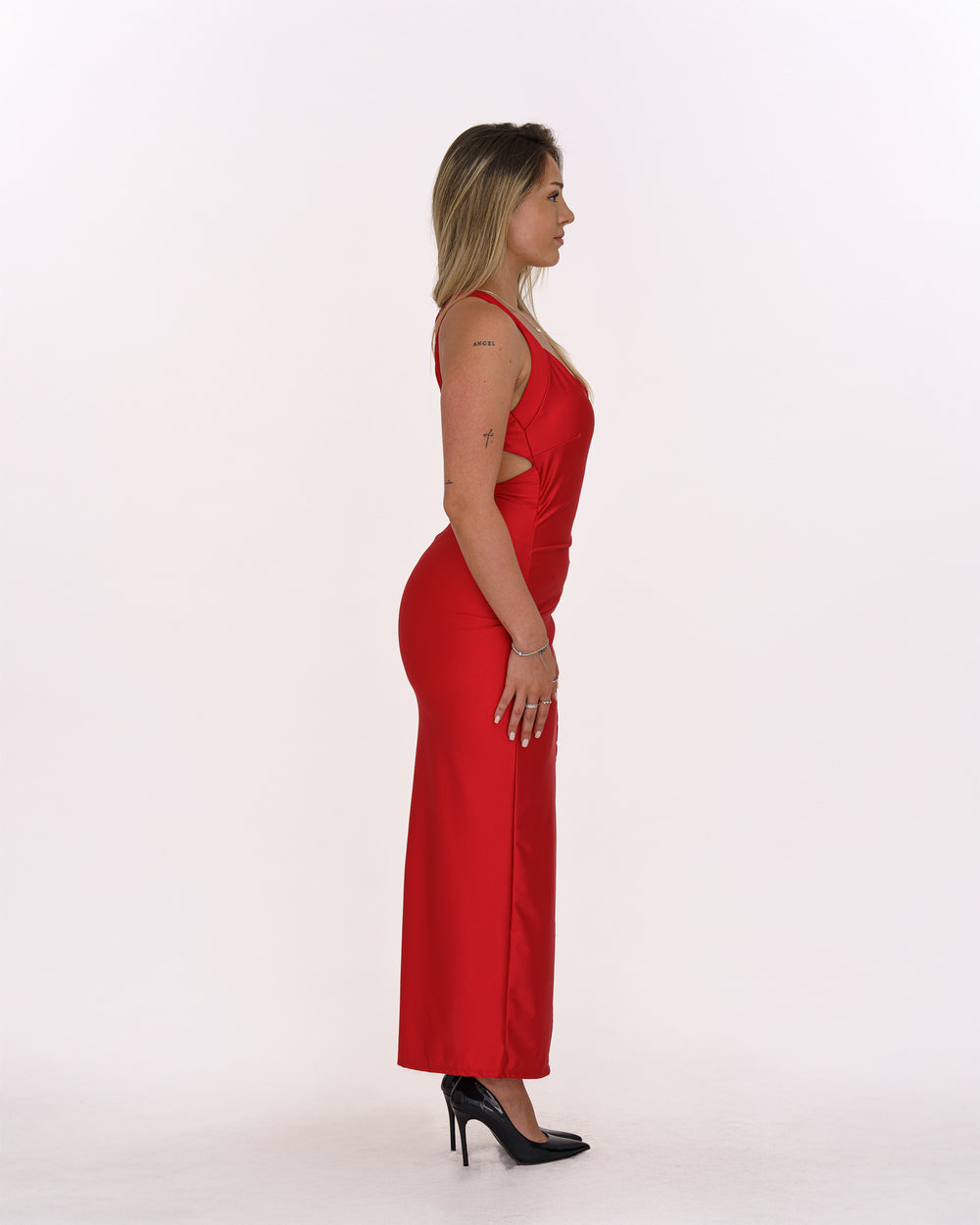 Elegantes Rotes Kleid mit Schlitz und Rückenfreier Trägerführung