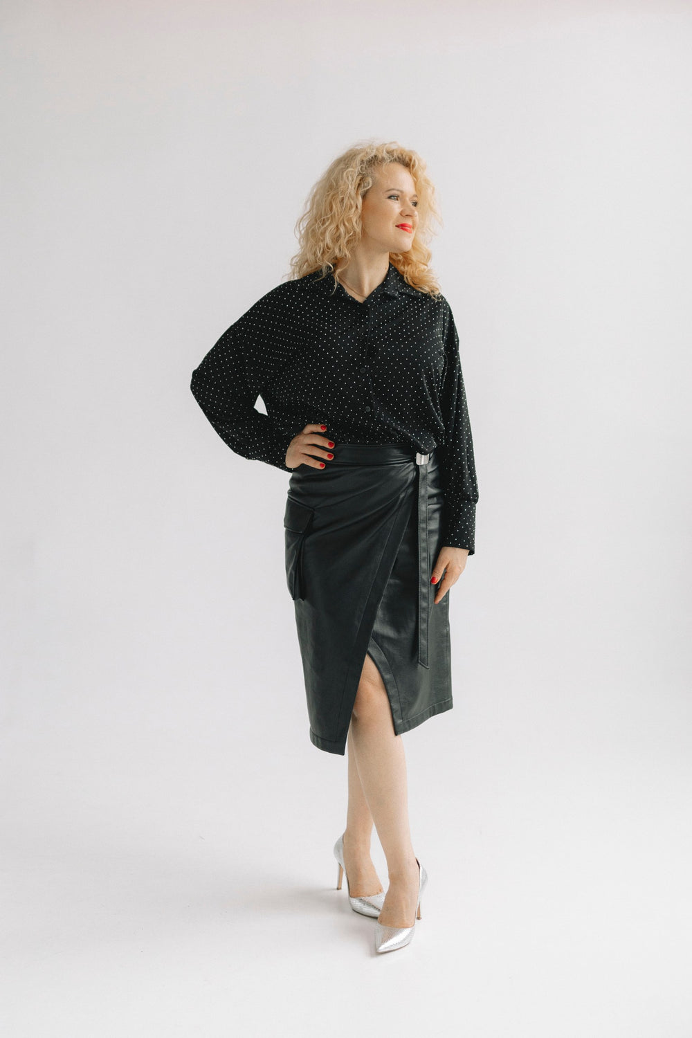 Kombiniere dazu Wide-Leg-Hosen und chunky Sneakers oder Loafer.Monochrome Outfits mit Kontrasten Kombiniere die schwarze Bluse mit schwarzem Satin oder Leder und setze auf auffällige Accessoires wie eine Metallic-Tasche oder Ohrringe.