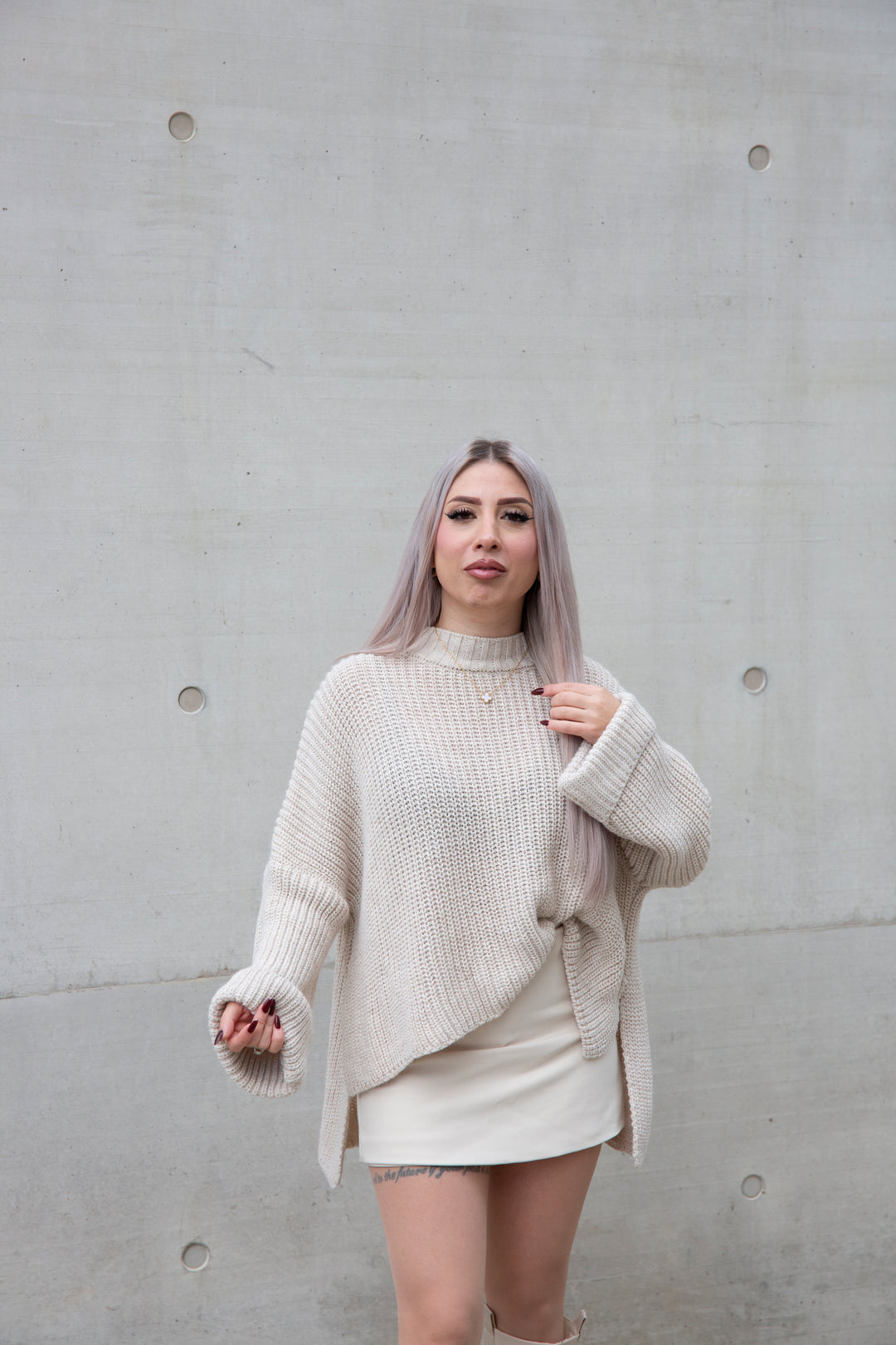 Der Strickpullover ist in einem gehalten und hat eine lockere, weite Passform. Er ist aus grobem Strickmaterial gefertigt und verfügt über einen hohen Rundhalsausschnitt. Die Ärmel sind lang und leicht oversized, was dem Pullover einen lässigen und gemütlichen Look verleiht. Der Saum ist asymmetrisch geschnitten, sodass der Pullover vorne etwas kürzer ist als hinten.