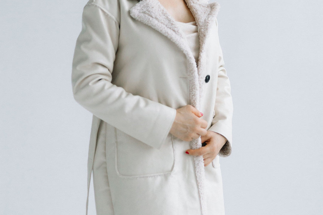 Der Mantel scheint ein gefüttertes Modell zu sein, was ihn perfekt für kühlere Temperaturen macht. Hier einige übliche Materialien für einen gefütterten Mantel: